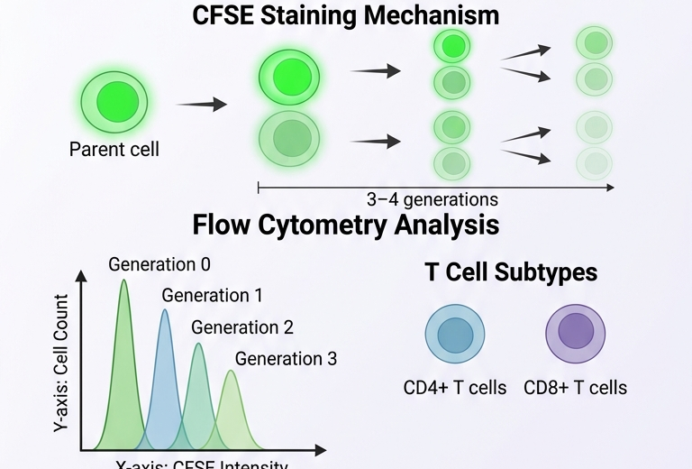 In scientific research, understanding how cells divide is extremely important. One powerful experimental method used to measure immune cell division is the CFSE T cell proliferation assay, which uses fluorescent labeling combined with flow cytometry.